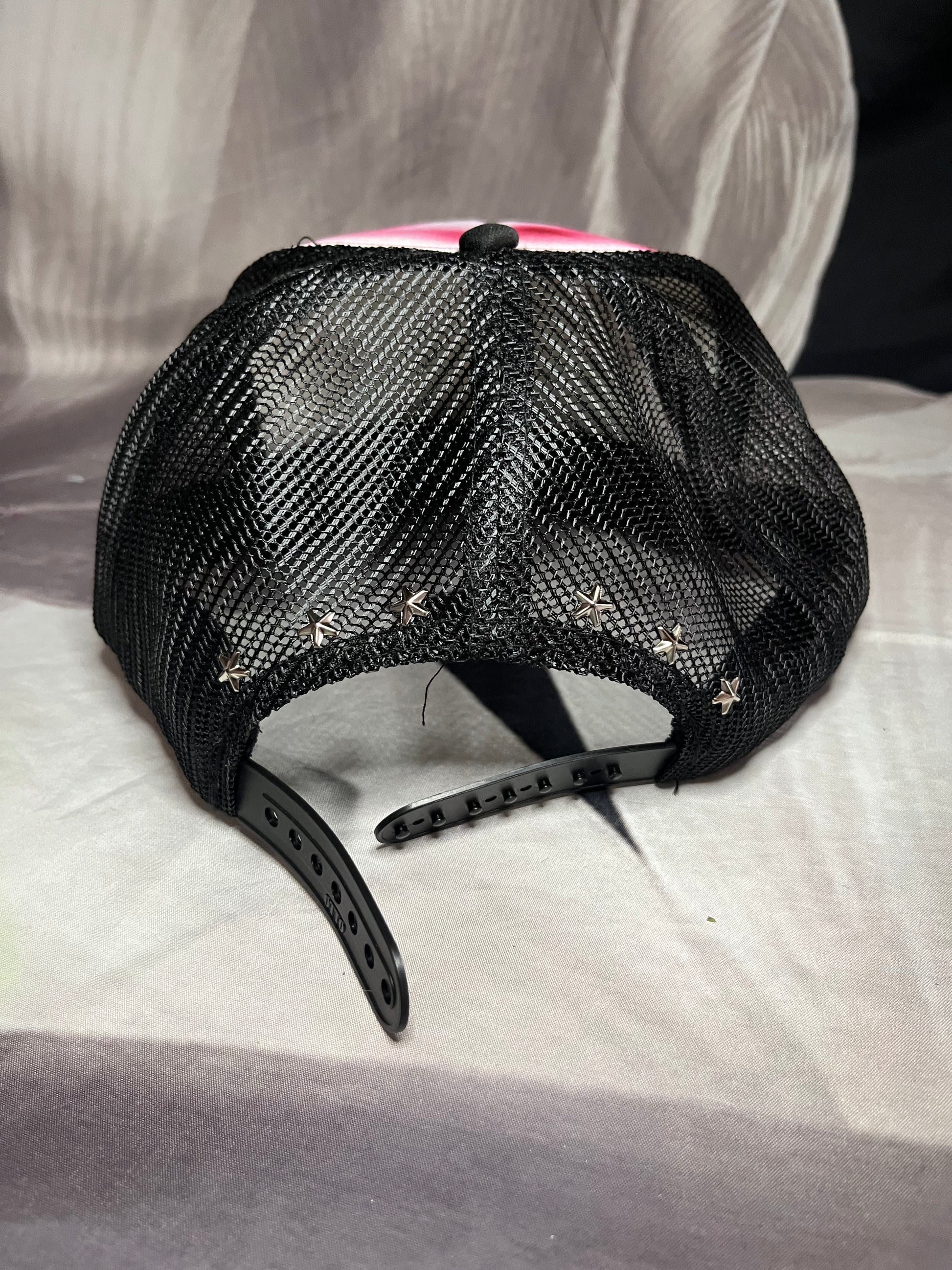 Custom made M.O.B Airbrushed Gods Gift Trucker hat with unique distressing and design,