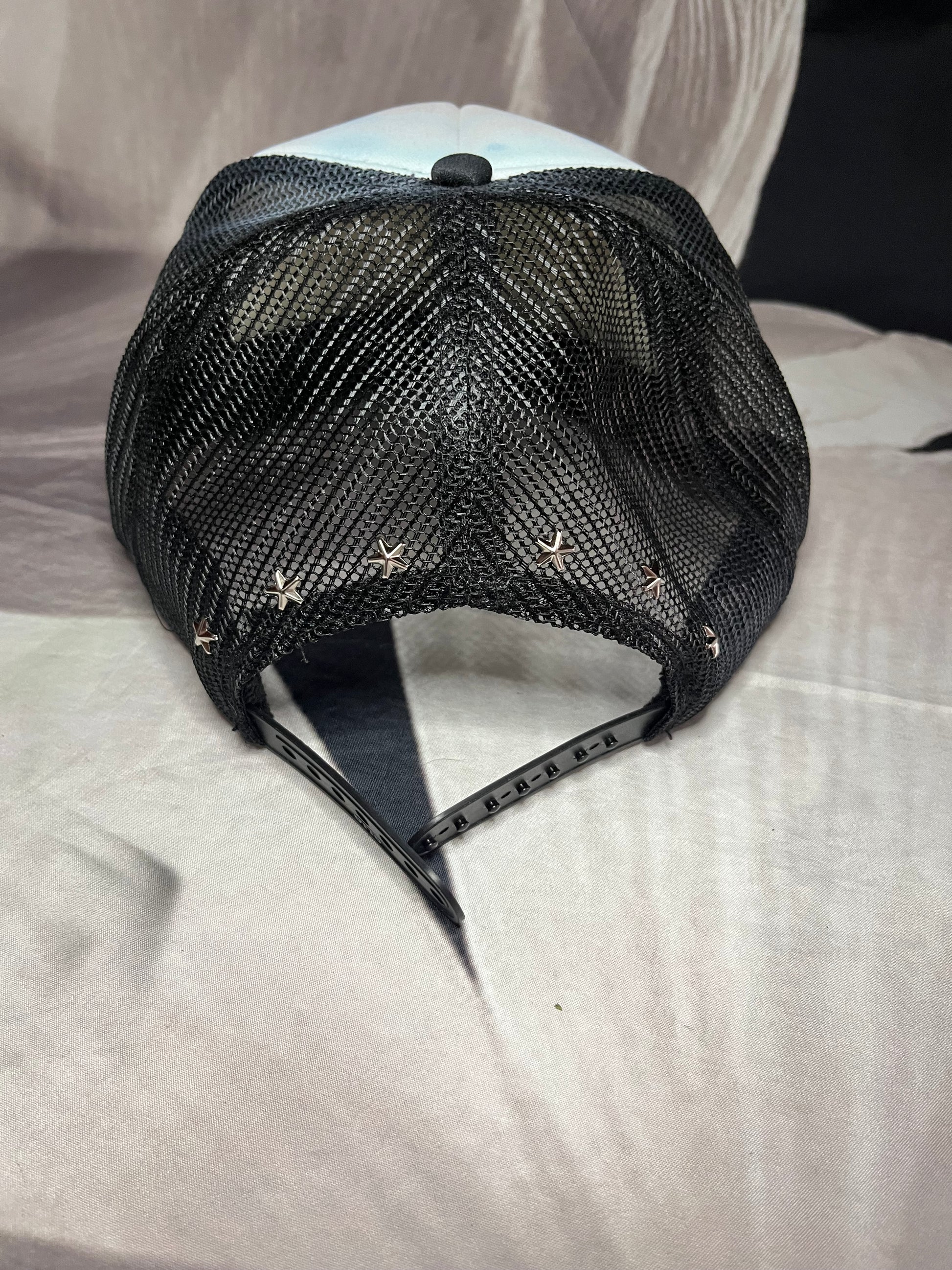 Custom made M.O.B Airbrushed Gods Gift Trucker hat with unique distressing and design,