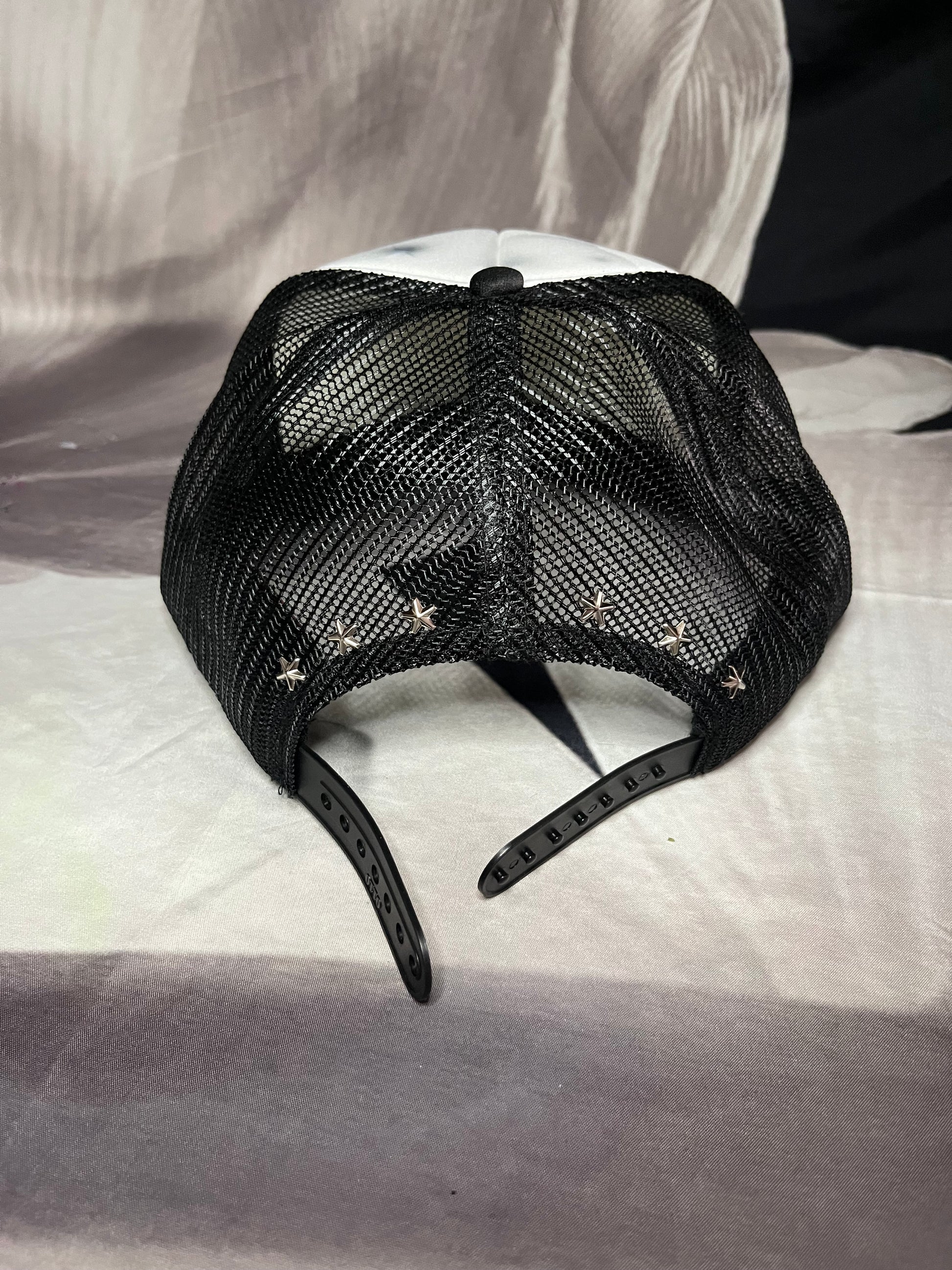 Custom made M.O.B Airbrushed Gods Gift Trucker hat with unique distressing and design,